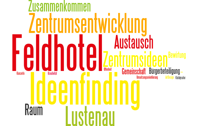 Das Feldhotel – ein temporäres Gebäude – wurde im Auftrag der Art Design Feldkirch von Martin Mackowitz und Nik Skorpik erschaffen und wandert seit der Art Design 2013 durch Vorarlberg. Das Feldhotel macht dort Halt, wo es einen guten Raum braucht, um Notwendiges und Zukünftiges zu verhandeln. In Lustenau wurde das Feldhotel zu einem Raum für den Austausch der Zentrumsideen. Es entstand eine Dorfbeiz in der sich Bürgerbeteiligung genießen und Gemeinschaft kultivieren lässt.